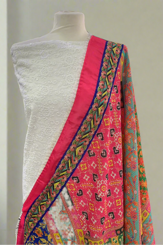 388 White 4pc Cotton Chikenkari Suit with Colourful Dupatta