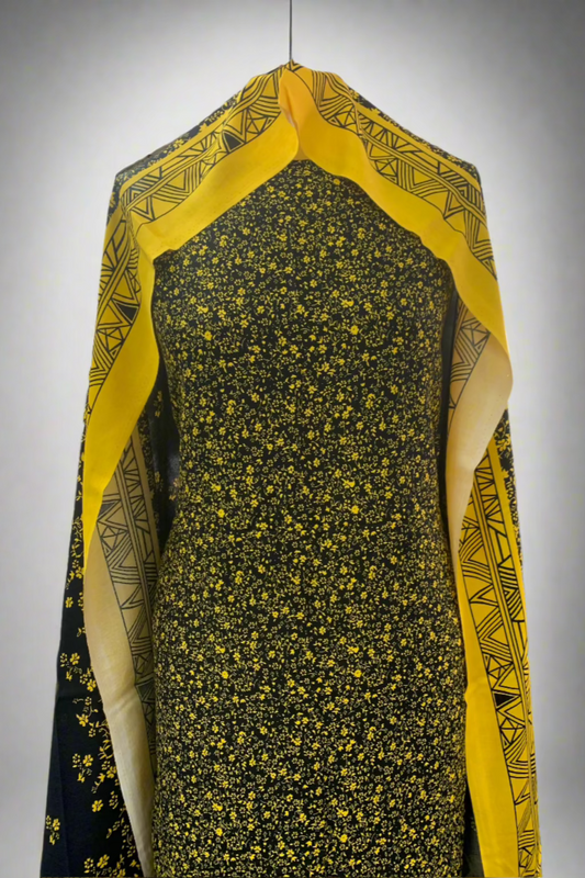 D114 Unstitched Black Floral Print Viscose 3pc Suit