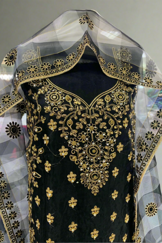 D101 Gold Embroidery Organza 4pc Unstitched Party Suit