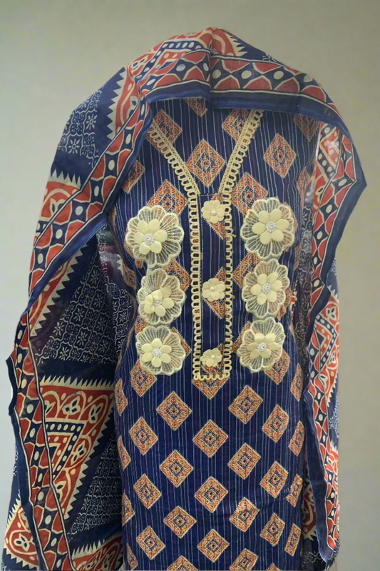 9347 Lace Detail Floral Cotton 3pc Unstitched Suit