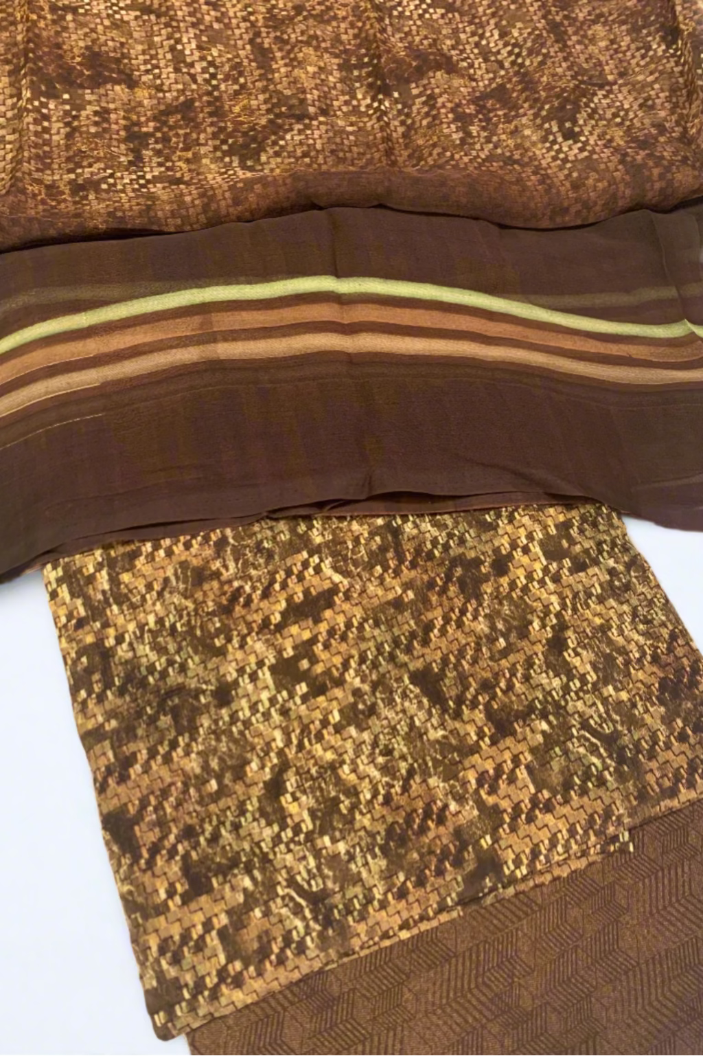 A beautiful light-weight abstract print 3pc suit, this 3pc crepe suit has a printed trouser fabric and a checkered abstract printed shirt fabric with a lovely stripe printed chiffon dupatta. It has lovely drape and a soft feel, it is great for the spring and summer season.