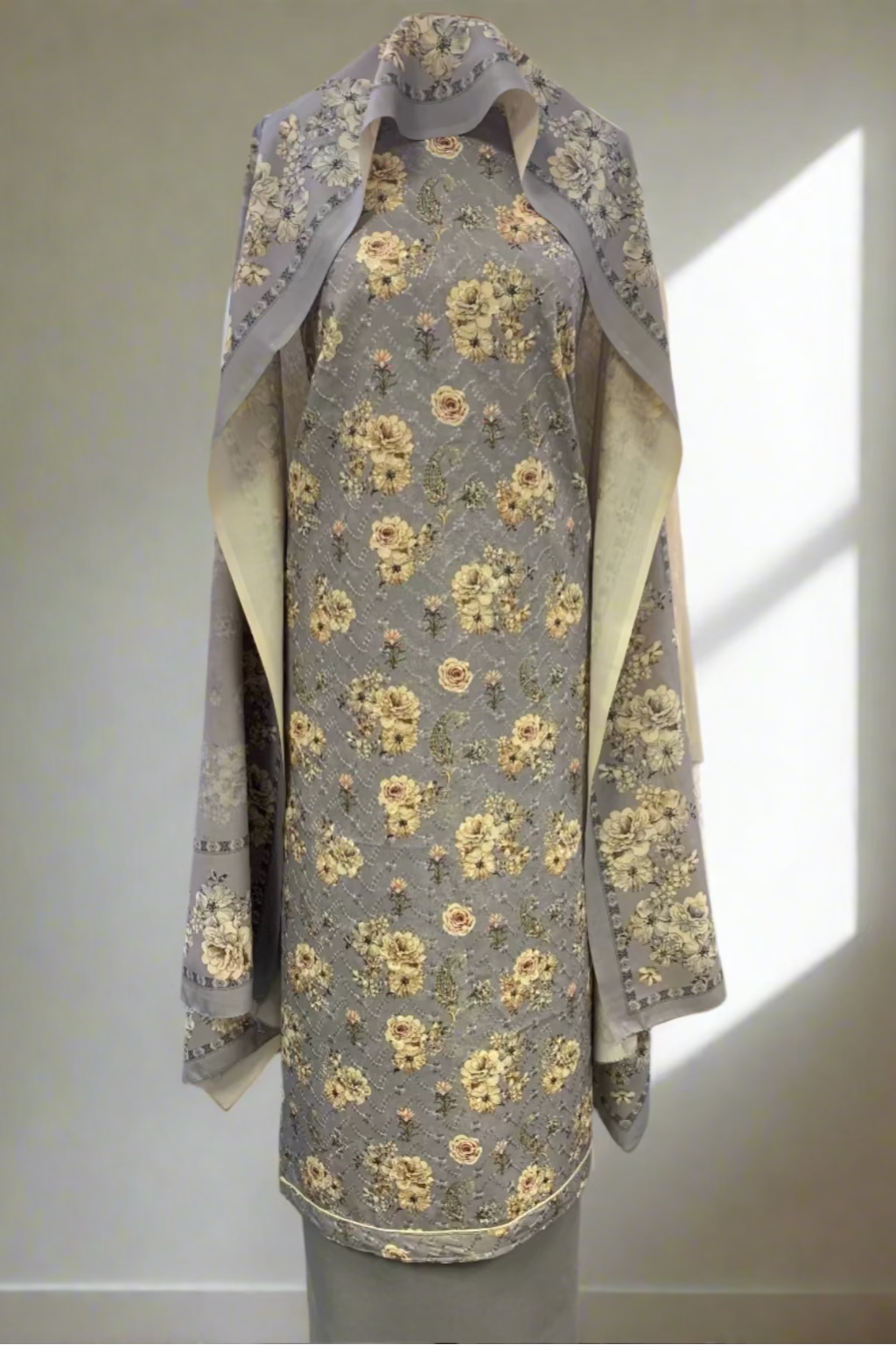 A beautiful medium-weight printed 3pc warm suit. This 3pc suit comes with a floral printed alpine shirt fabric with an piped border, it also features delicate embroidery all over the front of shirt fabric. It comes complete with plain trouser fabric and a printed dupatta. It has lovely drape and a soft feel, it is ideal for cooler days, daily wear and for special occasions.