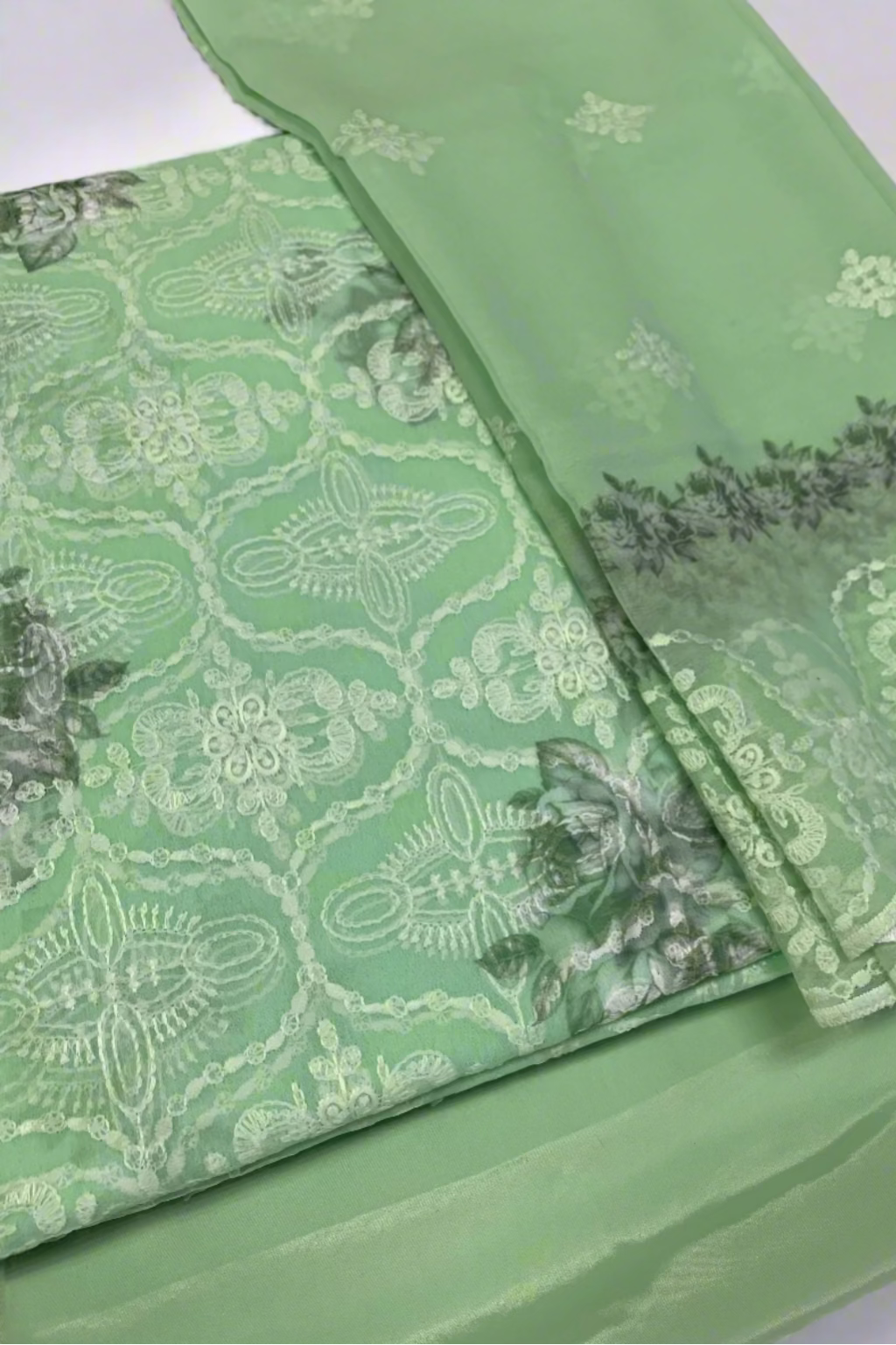 A beautiful light-weight stunning georgette 4pc unstitched ladies suit, the kameez features a stunning flower print with a delicate floral embroidery design all over both sides of the fabric. The light-weight dupatta which has a beautiful floral print with embroidery and a scallop lace border.